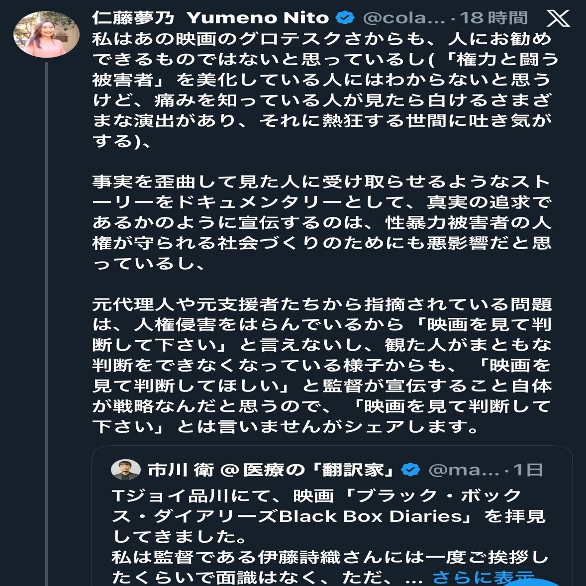 画像に示された仁藤夢乃氏のXの投稿は、『Black Box Diaries』に対して「グロテスクだ」「『権力と闘う被害者』を美化している」「痛みを知っている人が見たら白けるさまざまな演出がある」と批判している。この発言は、いくつもの深刻な問題を孕んでいる。